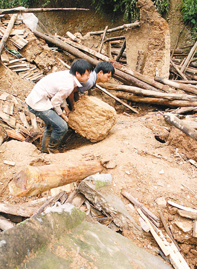15歲的邵玉乾能撿回一條命完全得益于他的貪玩。24日上午,盡管雨大,他還是帶著小外甥到房子后面的山坡上玩,不巧,小外甥陷到泥里,全身濕透,他跑回去給拿了件衣服。剛到半山腰,突然,腳下好像地動(dòng)山搖,緊接著“卡啦卡啦”巨大的聲響,像爆炸一樣,山上的泥石流瞬間沖向?qū)γ娴纳狡,又折回頭沖向他這邊。他前面不遠(yuǎn)處的一排房子全倒了。他趕緊跑過(guò)去看,奶奶被泥石淤在腰部,大聲喊著救命。這時(shí),旁邊有人趕來(lái),幾人用手刨了2個(gè)多小時(shí),奶奶終于被救出。但是,邵玉乾的姐姐邵玉娟、妹妹邵玉苗,卻被埋在泥石之下。
