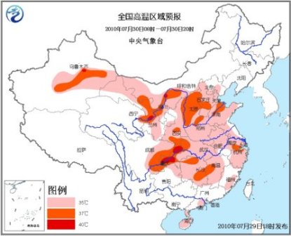 預(yù)計(jì),明天白天,新疆吐魯番盆地及南疆盆地東部、內(nèi)蒙古西部偏南地區(qū)、甘肅大部、青海東北部、寧夏大部、陜西大部、華北大部、黃淮、江淮大部、江漢、江南大部、四川盆地、重慶、貴州東北部、海南大部等地有35~37℃的高溫天氣,其中,重慶、甘肅中部、吐魯番盆地等地局部最高氣溫可達(dá)40℃以上。