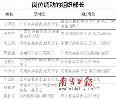 令人十分關(guān)注的是,已有三位省級組織部長調(diào)任中央。其中,原廣東省委組織部長胡澤君任最高人民檢察院黨組副書記、常務(wù)副檢察長;原廣西自治區(qū)組織部長陳向群任中組部部務(wù)委員、組織二局局長;原湖北省委組織部長潘立剛?cè)沃薪M部部務(wù)委員、干部二局局長。據(jù)公開的資料顯示,此三人在擔(dān)任地方組織部長前,均有在中央部委的工作經(jīng)歷。
