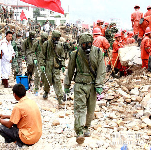 記者在現(xiàn)場(chǎng)看到,蘭州軍區(qū)某集團(tuán)軍防化團(tuán)官兵對(duì)每名挖出來(lái)的遇難群眾遺體進(jìn)行認(rèn)真細(xì)致的消毒、殺菌。核生化應(yīng)急救援分隊(duì)的官兵身著密不透風(fēng)的連體橡膠防護(hù)服,攜帶手持消毒機(jī)對(duì)救災(zāi)現(xiàn)場(chǎng)實(shí)施噴灑作業(yè),每走幾步,都會(huì)大汗淋漓。防化團(tuán)團(tuán)長(zhǎng)蒲軍禮告訴記者,現(xiàn)在防疫形勢(shì)仍然很嚴(yán)峻,因?yàn)橛鲭y者遺體挖掘出來(lái)后,氣味很大,消毒必須嚴(yán)密組織。為了保障救災(zāi)工作順利進(jìn)行,部隊(duì)規(guī)定,只要在災(zāi)區(qū)作業(yè),帶手套、帶口罩、穿長(zhǎng)袖要作為一項(xiàng)紀(jì)律嚴(yán)格執(zhí)行。
