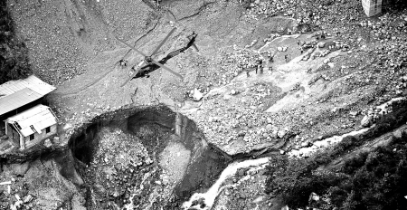 從機艙往下看,翠綠的山體上一道道灰白色的泥石流觸目驚心,曾經(jīng)的美麗小鎮(zhèn)被泥石流拉開一道巨大的傷口。