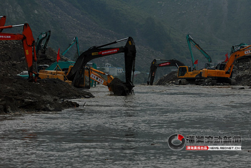 隨著入口擴(kuò)大,搶險(xiǎn)隊(duì)伍同時(shí)在岷江右岸(改道后的河道)鋪設(shè)了一條150米長(zhǎng)的進(jìn)站道,以利重型機(jī)械通過(guò),并準(zhǔn)備在明后天對(duì)改道后的岷江河道進(jìn)行截流。