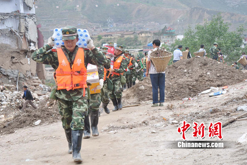 中新網(wǎng)舟曲8月19日電 (李樹(shù)洲 龐紅升 姜雪良 )連日來(lái),武警甘肅森林總隊(duì)官兵以10人為一小組,在舟曲羅家峪、小新溝村災(zāi)區(qū),進(jìn)村入戶,為人民群眾送上生活急需物資,用真情和汗水譜寫了一曲愛(ài)民助民的動(dòng)人樂(lè)章。