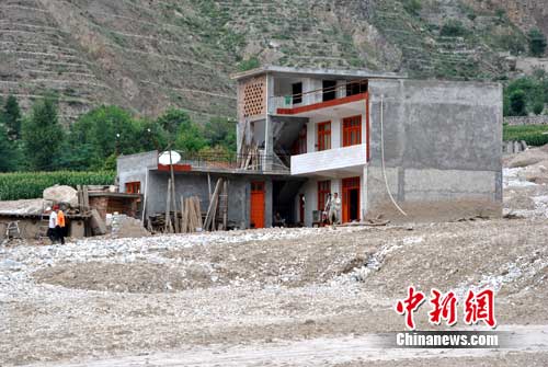 舟曲的月圓村和三眼村幾乎痍為平地,然而在泥石流沖毀的砂石灘上,有一座房屋在干涸的泥石中央孤零零的挺立著,顯得極為突兀。