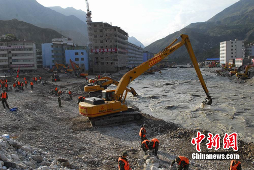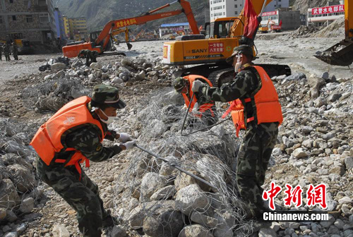 自8月8日以來,武警水電部隊(duì)500余名官兵和130余臺(tái)大型機(jī)械設(shè)備日夜連續(xù)奮戰(zhàn)在舟曲白龍江堰塞體搶險(xiǎn)一線,他們采取“挖、裝、運(yùn)”相結(jié)合、調(diào)運(yùn)長臂反鏟深掏、人工安裝鐵絲籠固定護(hù)坡等作業(yè)方式,疏通河道,加快白龍江存水泄流速度,盡快消除洪水隱患。