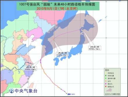 今年第7號(hào)臺(tái)風(fēng)“圓規(guī)”于9月1日13時(shí)在東海北部海面上加強(qiáng)為強(qiáng)臺(tái)風(fēng),17時(shí)其中心位于韓國(guó)濟(jì)州西偏南方大約170公里的海面上,就是北緯33.2度、東經(jīng)124.7度,中心附近最大風(fēng)力有14級(jí)(45米/秒),中心最低氣壓為955百帕。