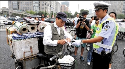 昨天上午9點(diǎn),記者在東單路口看到,8名民警“把守”在路口4個方向,由于正值上班高峰,路口騎車人較多,大部分人能等待紅燈,幾名想“闖關(guān)”的騎車人被民警和協(xié)管員攔住。市民小陳騎電動自行車載人,被執(zhí)勤民警攔下并處以罰款20元。記者注意到,民警處理的多是自己加裝動力裝置的三輪車!白孕屑友b動力裝置很危險!泵窬f,行人、非機(jī)動車的違法行為主要有騎車帶人、逆行、闖紅燈等。昨天上午兩個小時內(nèi),僅東單路口一處,民警就處罰了20多起行人、非機(jī)動車的違法行為。