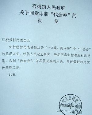 那么,村委會私自印制發(fā)行代金券的行為是否合法呢?面對記者的追問,三位村官都以沉默作答。再三追問之下,他們出示了當(dāng)?shù)劓?zhèn)政府對此做過的批示。批示上蓋有宜賓縣喜捷鎮(zhèn)人民政府的公章。批復(fù)中寫道,經(jīng)鎮(zhèn)人民政府研究,決定同意你村印制代金券。