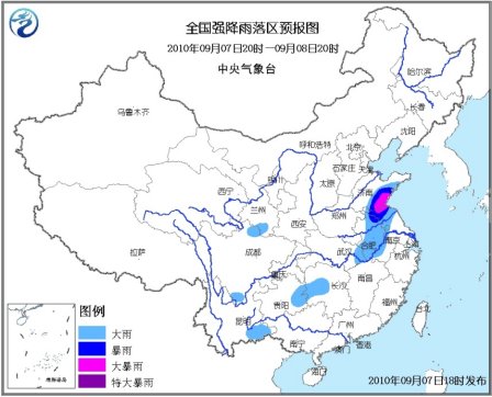 中新網(wǎng)9月7日電 據(jù)中央氣象臺網(wǎng)站消息,中央氣象臺9月7日18時繼續(xù)發(fā)布暴雨藍(lán)色預(yù)警:9月7日20時到8日20時,山東中南部、安徽大部、江蘇北部和西部、湖北東部、湖南中部偏西地區(qū)、貴州東部、甘肅東南部、川西高原北部、云南東南部等地有大雨或暴雨,其中,山東東南部和江蘇北部的局部地區(qū)有大暴雨;上述部分地區(qū)并伴有短時雷雨大風(fēng)等強對流天氣。
