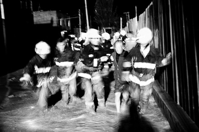 22時(shí)45分,所調(diào)集的東崗中隊(duì)一臺(tái)照明車正趕往現(xiàn)場(chǎng)。23時(shí)33分,特勤一中隊(duì)7名戰(zhàn)斗員到達(dá)現(xiàn)場(chǎng)。由于道路房屋都被泥水淹沒(méi),給救援工作帶來(lái)了很大的困難。官兵們手抓大繩,走在齊腰深的淤泥中,一步一步到達(dá)現(xiàn)場(chǎng)后,發(fā)現(xiàn)多名群眾被困在房里面。時(shí)間就是生命!中隊(duì)長(zhǎng)周暉立即命令一中隊(duì)官兵迅速展開(kāi)救援,由于泥水淹至膝蓋,所有官兵只能緩慢的靠近被困群眾,然后一個(gè)個(gè)攙扶的進(jìn)行轉(zhuǎn)移。