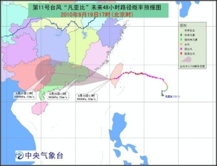 今年第11號(hào)強(qiáng)臺(tái)風(fēng)“凡亞比”于19日14時(shí)在中國(guó)臺(tái)灣省臺(tái)南縣楠西鄉(xiāng)境內(nèi)減弱為臺(tái)風(fēng),17時(shí)臺(tái)風(fēng)中心位于臺(tái)南縣七股鄉(xiāng)境內(nèi),就是北緯23.1度、東經(jīng)120.1度,中心附近最大風(fēng)力有12級(jí)(35米/秒),中心最低氣壓為965百帕。