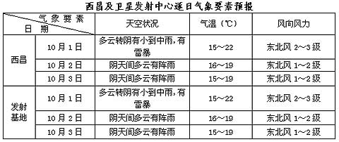 中國西昌衛(wèi)星發(fā)射中心的權(quán)威發(fā)布:“嫦娥二號”衛(wèi)星今天(10月1日)晚上即將迎來第一個發(fā)射窗口。預(yù)計今天空間天氣平靜,對嫦娥二號發(fā)射過程無不利影響;今天到4日,西昌市及衛(wèi)星發(fā)射基地以陰天或陰天間多云天氣為主,多陣性降水。