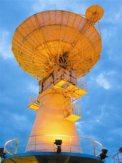 甲板上,2個巨大的乳白色雷達鍋,警覺地注視著衛(wèi)星即將飛來的方位。船艙內(nèi),一排排彩色顯示屏幕上,不斷變化著各種信息畫面和數(shù)據(jù)。船員們各自堅守著崗位。