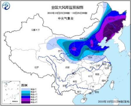根據(jù)這份寒潮藍(lán)色預(yù)警,預(yù)計(jì),10月23日08時(shí)至25日08時(shí),內(nèi)蒙古大部、東北、甘肅大部、西北地區(qū)東部、華北、黃淮、江淮北部等地將出現(xiàn)6~12℃降溫,其中,寧夏中部、河北西部和東北部、內(nèi)蒙古東南部、東北大部等地的部分地區(qū)降溫幅度可達(dá)14~16℃;上述大部地區(qū)有4~6級(jí)偏北風(fēng)。