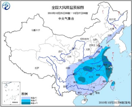 未來三天,隨著冷空氣繼續(xù)東移南下,主降溫區(qū)也將開始向南轉(zhuǎn)移。中央氣象臺(tái)今天早晨6時(shí)繼續(xù)發(fā)布寒潮藍(lán)色預(yù)警。預(yù)計(jì),25日08時(shí)至27日08時(shí),東北東南部、華北南部、陜西南部、黃淮、江淮、江漢、江南、華南大部、西南地區(qū)東部等地將出現(xiàn)6~8℃降溫,其中,黃淮東部、江淮東部、江南東部、江漢南部、貴州東部、湖南西部等地的部分地區(qū)降溫幅度可達(dá)10℃;上述大部地區(qū)有4~6級(jí)偏北風(fēng)。