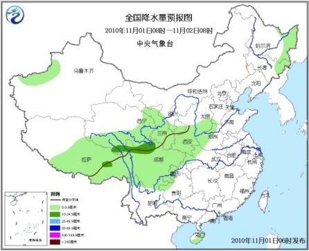 11月1日08時至2日08時,新疆南疆西北部、青海南部和東部、西藏中東部、甘肅中南部、寧夏南部、川西高原北部、黑龍江東部、吉林東部等地的部分地區(qū)有小到中雨(雪)或雨夾雪,其中,西藏東北部、青海東南部、川西高原北部的局地有大到暴雪;西北地區(qū)東南部、山西南部、河南西部和北部、湖北西北部、四川大部、重慶西部和北部、云南西北部、貴州西北部以及海南大部等地有小到中雨或陣雨;內(nèi)蒙古東北部、東北等地有4~6級風(fēng);臺灣海峽、臺灣以東洋面和以南海域、南海東北部和中部海域?qū)⒂?~8級、陣風(fēng)9級的東北風(fēng),渤海將有6~7級、陣風(fēng)8級的東北風(fēng);黃海北部和中部海域?qū)⒂?~7級、陣風(fēng)8級的偏北風(fēng),黃海南部海域、東海大部海域?qū)⒂?~6級偏北風(fēng)。