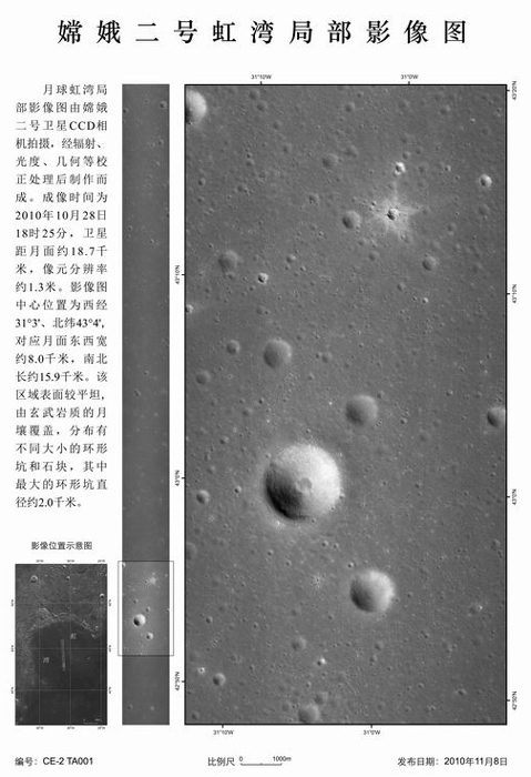 據(jù)中央電視臺報道,首次公布的月球虹灣地區(qū)局部影像圖是一張黑白照片。據(jù)國防科技工業(yè)局有關(guān)負責(zé)人介紹,該影像成像時間為10月28日18時,是衛(wèi)星距離月面大約18.7公里地方拍攝獲取。影像圖的傳回,標(biāo)志著嫦娥二號任務(wù)所確定的六個工程目標(biāo)已經(jīng)全部實現(xiàn)。這意味著探月工程二期“嫦娥二號”工程任務(wù)取得圓滿成功。