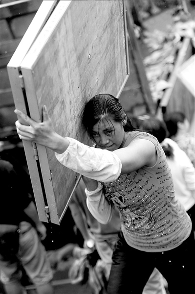 羅炳輝將軍廣場是彝良最大的災(zāi)民安置點之一,2000名受災(zāi)群眾集中安置在百余個帳篷內(nèi)。50多歲的毛振強和老伴帶著兩個孫子一起住在帳篷里。前天夜間,他和安置點的其他人一樣,被大風(fēng)和暴雨擾得睡不著覺。昨天凌晨1點左右,廣場上開始積水,很快水就漫過薄薄的紙板,被褥衣物都洇濕了!拔覀冓s緊把東西收拾起來,就這么站了一夜沒能睡覺!庇捎趲づ駜(nèi)物品進水,昨天白天,安置點內(nèi)的很多災(zāi)民連坐的地方都沒有,蹲在地上吃飯,也沒法睡覺。