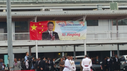 雖然時(shí)間短暫,但斐濟(jì)對(duì)習(xí)大大的到來(lái)那是相當(dāng)?shù)闹匾暋0,?xí)大大專(zhuān)機(jī)抵達(dá)楠迪國(guó)際機(jī)場(chǎng)時(shí),斐濟(jì)總理姆拜尼馬拉馬夫婦親自到舷梯旁迎接,并在機(jī)場(chǎng)舉行歡迎儀式。楠迪街頭,隨處可見(jiàn)習(xí)大大巨幅照片,當(dāng)?shù)厝藫]舞兩國(guó)國(guó)旗,在中國(guó)代表團(tuán)車(chē)隊(duì)經(jīng)過(guò)的路線沿途迎接。