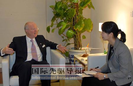 國際先驅(qū)導報記者熊爭艷發(fā)自北京 在美國駐華使館官員陪同下,經(jīng)過幾道關(guān)卡,在新使館大樓的會客室內(nèi)才見到了兩鬢斑白、神采奕奕的雷德大使。不到半個小時的采訪中,雷德思路清晰,語言幽默,并時常發(fā)出爽朗的笑聲。
