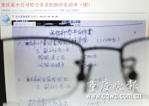 “過(guò)年了,企業(yè)開始送錢了!”6日,天涯論壇重慶社區(qū)、重慶記者之家等網(wǎng)站驚現(xiàn)一份給公務(wù)員、檢驗(yàn)站的“送禮清單”。這份清單共涉及20個(gè)紅包,個(gè)個(gè)上千元,最高2000元。