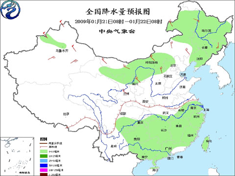 中央氣象臺2009年1月21日6時發(fā)布未來三天天氣預報: