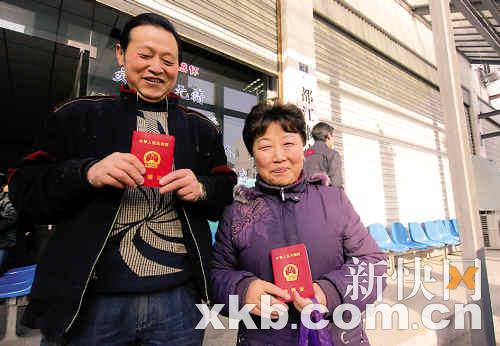 昨天早上10時,陽光明媚,重新拿到結(jié)婚證的譚興茂夫婦走出了辦證大廳!拔覀円郧暗慕Y(jié)婚證是張獎狀,好像是國家對我們愛情的表揚!弊T興茂拿著小紅本本對記者說。不過對于新版的結(jié)婚證,譚興茂的妻子趙樹清很興奮,她非常幽默地說:“60多歲了,就當又結(jié)了一次婚,可惜老頭子還是那個人……”即使如此,譚興茂還是打算回去再擺一次酒!凹词褂衼砩,我還是會娶她的。”譚興茂說。