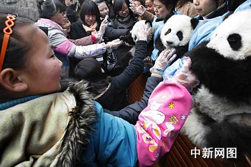 當(dāng)工作人員抱著只有半歲大的三只大熊貓寶寶走出熊貓?zhí)柈a(chǎn)房時(shí),孩子們都戴上了專用的塑料手套,爭先恐后上前撫摸熊貓寶寶。說起第一次親密接觸的感受,孩子們打了一個(gè)很形象的比喻:“摸上去就像摸柔軟的羽絨服一樣,很舒服。”