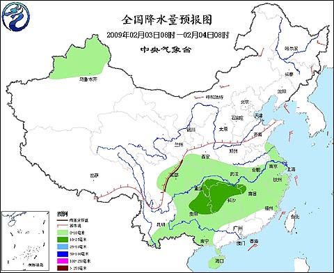 中央氣象臺2009年2月3日06時(shí)發(fā)布未來三天天氣預(yù)報(bào):