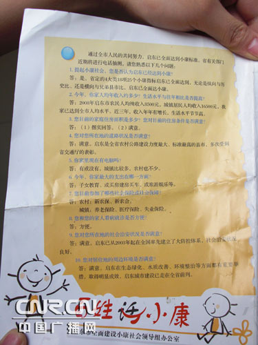 在多位村民家中,記者都看到了由啟東市全面建設(shè)小康社會(huì)領(lǐng)導(dǎo)小組辦公室印發(fā)的電話調(diào)查問卷。在這份印刷精美的問卷中共列有十個(gè)問題,并給出了標(biāo)準(zhǔn)答案。無論實(shí)際家庭人均年收入多少,農(nóng)村居民必須回答8500元,城鎮(zhèn)居民必須回答16500元。無論是否參加社會(huì)保險(xiǎn)或保障,都必須回答參加了;無論對(duì)住房、道路、居住環(huán)境是否滿意,都必須回答滿意。
