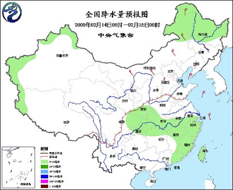 中央氣象臺2009年2月14日06時(shí)發(fā)布未來三天天氣預(yù)報(bào):