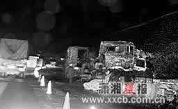 昨晚9時(shí)50分,記者乘坐的采訪車終于抵達(dá)車禍現(xiàn)場(chǎng)。交警用警示標(biāo)志攔出一段約200米遠(yuǎn)的警示帶,只留下一個(gè)車道供車輛通行。不遠(yuǎn)處,3臺(tái)被燒壞的貨車擺在公路一側(cè),一臺(tái)貨車上的棉布已經(jīng)燒毀,3臺(tái)車嚴(yán)重受損,F(xiàn)場(chǎng)有兩名交警維持秩序,其他受損車輛和死傷病員已轉(zhuǎn)離現(xiàn)場(chǎng)。