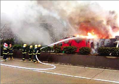 據(jù)交警介紹,車禍發(fā)生時(shí),一輛貨車滿載打火機(jī)及洗發(fā)水等易燃易爆物品,因此火勢(shì)很猛,車上不時(shí)傳來打火機(jī)的爆炸聲,碎片不斷地從車廂內(nèi)飛出,貨車的油箱也處于被烘烤狀態(tài),隨時(shí)有爆炸的危險(xiǎn)。