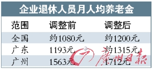 記者昨日從廣州市勞動(dòng)和社會(huì)保障局了解到,2008年末,廣州的企業(yè)退休人員養(yǎng)老待遇達(dá)到1563元/人·月,相比2007年,月人均增加264元,增幅為20.32%。今年春節(jié)前,廣州再次提高養(yǎng)老金,月人均增發(fā)165元,增幅為10.67%,調(diào)整后達(dá)到1712元/人·月,在各大城市中居于前列。(記者蔣悅飛)