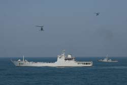 “艦艇編隊(duì)高速接近目標(biāo),保持距離進(jìn)行跟蹤監(jiān)視;艦載機(jī)繼續(xù)進(jìn)行跟蹤飛行!焙I现笓]員、基地副參謀長黃鳳至果斷下達(dá)指令,并向上級(jí)申請(qǐng):“電子對(duì)抗部隊(duì)用短波對(duì)被劫持貨輪短波通信實(shí)施干擾;協(xié)調(diào)地方網(wǎng)管中心屏蔽恐怖分子IP地址,阻截與外部的通訊聯(lián)系和信息發(fā)送!