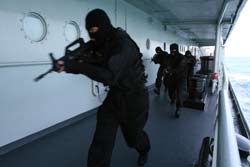 這時,我利用甚高頻國際頻道和高音喇叭對恐怖分子進行喊話,開展強大的心理攻勢和談判攻心。在談判未果的情況下,指揮員命令水面艦艇和空中火力支援的直升機,同時對恐怖分子進行火力壓制,掩護海上、空中突擊隊通過救生艇平面輸送和空中滑降的方式,快速、同時、多方位立體登臨被劫持貨輪。