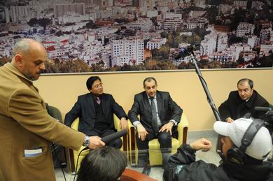 中新網(wǎng)2月23日電 據(jù)中國外交部網(wǎng)站消息,2月22日,中國與阿爾及利亞正式開通北京—阿爾及爾直飛航班。中國駐阿大使劉玉和、阿外交部亞大總司司長、交通部航空局局長等阿官員及部分駐阿中資機(jī)構(gòu)代表等作為貴賓一道乘首航班機(jī)前往北京。行前劉大使和阿航總裁阿卜杜拉共同接受了新華社、阿新社、阿電臺(tái)等媒體采訪。