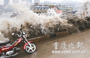 昨下午2時(shí),朝天門六碼頭,岸邊玩耍的市民突然遭遇兩米多高的巨浪襲擊。因躲閃不及,好幾位市民濕身。正在浮船上作業(yè)的水手也隨浮船被巨浪抬起半米多高,浮船險(xiǎn)些失控。