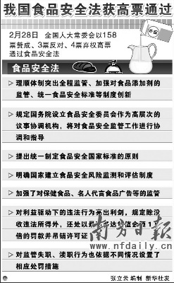 昨日,十一屆全國人大常委會(huì)經(jīng)表決,以158票贊成、3票反對、4票棄權(quán)高票通過了食品安全法。