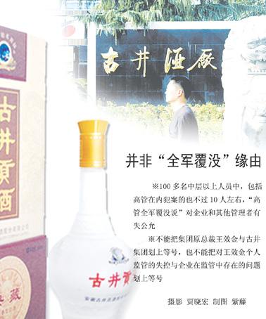 “不論在時空上還是判斷上,都不能這么隨意地將‘全軍覆沒’與古井集團高管劃上等號!辈芙芨嬖V記者,在王效金(古井集團原總裁)窩案中,古井集團的7名高管只有3人涉案,100多名中層以上人員中,包括高管在內(nèi)犯案的也不過10人左右,“高管全軍覆沒說”對企業(yè)和其他管理者有失公允。