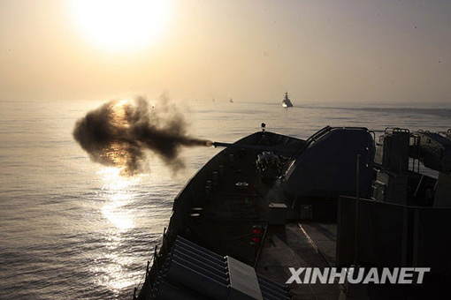 17時(shí)45分,海上實(shí)彈射擊浮體靶演練開始。17時(shí)58分,在急促的戰(zhàn)斗警報(bào)聲中,“廣州”艦實(shí)施主炮射擊。隨著一聲驚雷般巨響,該艦“海外第一炮”首發(fā)命中,擊沉3.5海里外的浮體靶,完成了“廣州”艦此行最主要的演習(xí)課目——海上實(shí)彈射擊,實(shí)現(xiàn)了既定目標(biāo)。在場(chǎng)觀摩的巴基斯坦和澳大利亞海軍觀察員當(dāng)即向中國(guó)海軍官兵豎起了大拇指。組織該課目演練的指揮艦——英國(guó)皇家海軍“波特蘭”號(hào)指揮官專門給“廣州”艦發(fā)來賀電,稱贊中國(guó)海軍“干得好”。指揮員陳岳琪說:“這是我們所希望的,也是我們努力的結(jié)果。參演官兵為國(guó)家、為海軍爭(zhēng)了光!”