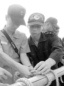 9月2日上午10時,“鹿島”號訓(xùn)練艦上的一個海曹(高級士官)將參加實習(xí)的外國學(xué)員帶到前甲板,開始演示撇纜繩。