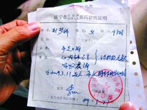 程傳勝,28歲,巨野縣章縫鎮(zhèn)程莊村人,他出具的女兒“診斷證明”上記載,程夢(mèng)嬌被診斷為“手足口病、心力不全、呼吸衰竭”,于2009年3月17日死亡,“特作此證明。”這份證明上,蓋有濟(jì)寧市傳染病醫(yī)院門診部的紅色印章。