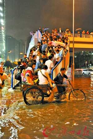 見(jiàn)聞:坐在車(chē)上,異味很重,幾個(gè)乘客把濕鞋脫下來(lái)晾。有人大聲講電話(huà):“我已經(jīng)坐了兩個(gè)小時(shí)了,才到華景路口。要不明天再走?”司機(jī)不時(shí)地打開(kāi)車(chē)門(mén),讓熬不住的人下車(chē)。