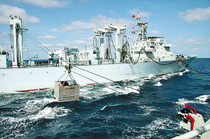 經(jīng)過9天9夜的航行,今天(注:11日)上午,海軍第二批護(hù)航編隊(duì)的“深圳”號(hào)導(dǎo)彈驅(qū)逐艦和“黃山”號(hào)導(dǎo)彈護(hù)衛(wèi)艦,在阿拉伯海與前出接應(yīng)的第一批護(hù)航編隊(duì)的“微山湖”號(hào)綜合補(bǔ)給艦會(huì)合,并實(shí)施了補(bǔ)給。