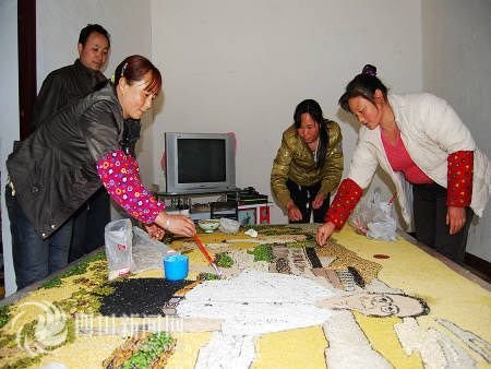 據(jù)介紹,整幅圖畫(huà)高一點(diǎn)八三米,寬三點(diǎn)零五米,以木板為底,畫(huà)面色彩搭配全部用當(dāng)?shù)厥a(chǎn)的玉米、黃豆、小豆、黑豆、蕎麥等二十多種雜糧拼貼。畫(huà)面內(nèi)容以山水環(huán)繞的棗樹(shù)村為背景,溫家寶總理居中,左右分別是棗樹(shù)村抗震救災(zāi)英雄石光華等村民。