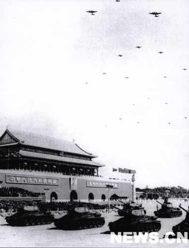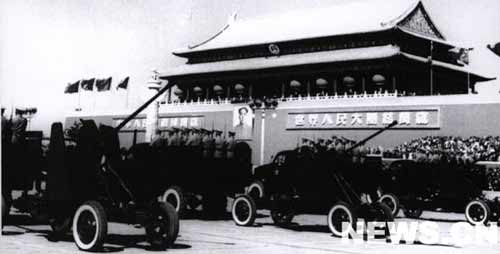 閱兵式開始。中國人民解放軍朱德總司令乘車閱兵。閱兵后,朱德總司令登臨檢閱臺宣讀《中國人民解放軍總部給全國武裝部隊的命令》,接著進(jìn)行武裝部隊的分列式。