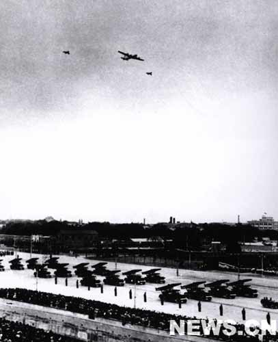 當(dāng)?shù)孛娌筷牻?jīng)過廣場時,在天空出現(xiàn)了英勇的鐵鷹,兩架殲擊機(jī)護(hù)送著一架領(lǐng)航機(jī)飛在前1954面,接著重轟炸機(jī)、噴氣式轟炸機(jī)和殲擊機(jī),一隊一隊地掠過天安門上空。