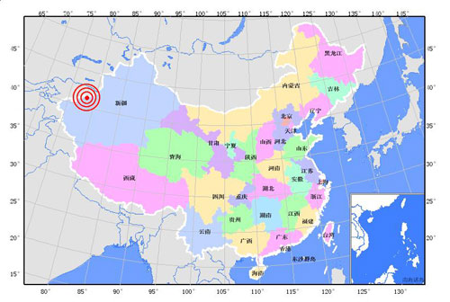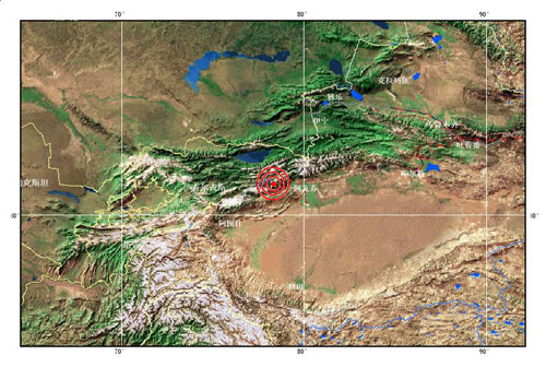 據(jù)測定,地震震中位于北緯四十一點(diǎn)三度, 東經(jīng)七十八點(diǎn)三度。