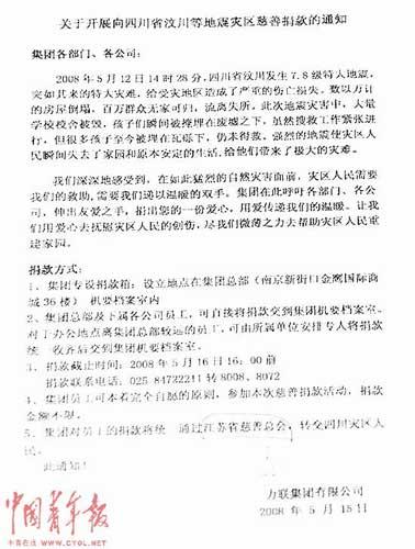 中國青年報記者多次采訪了其中的一名員工劉燕寧。劉燕寧告訴記者她就是捐款的經(jīng)辦人。2008年5月15日,汶川特大地震發(fā)生后,經(jīng)請示力聯(lián)集團(tuán)負(fù)責(zé)人翟韶均,力聯(lián)集團(tuán)發(fā)出了《關(guān)于開展向四川省汶川等地震災(zāi)區(qū)慈善捐款的通知》,號召廣大員工向災(zāi)區(qū)捐款。這一倡議得到了廣大員工的響應(yīng)和支持,很快,捐款源源而來。在指定的捐款截止日期——5月16日16:00前,公司募集到了地震捐款41423.1元。